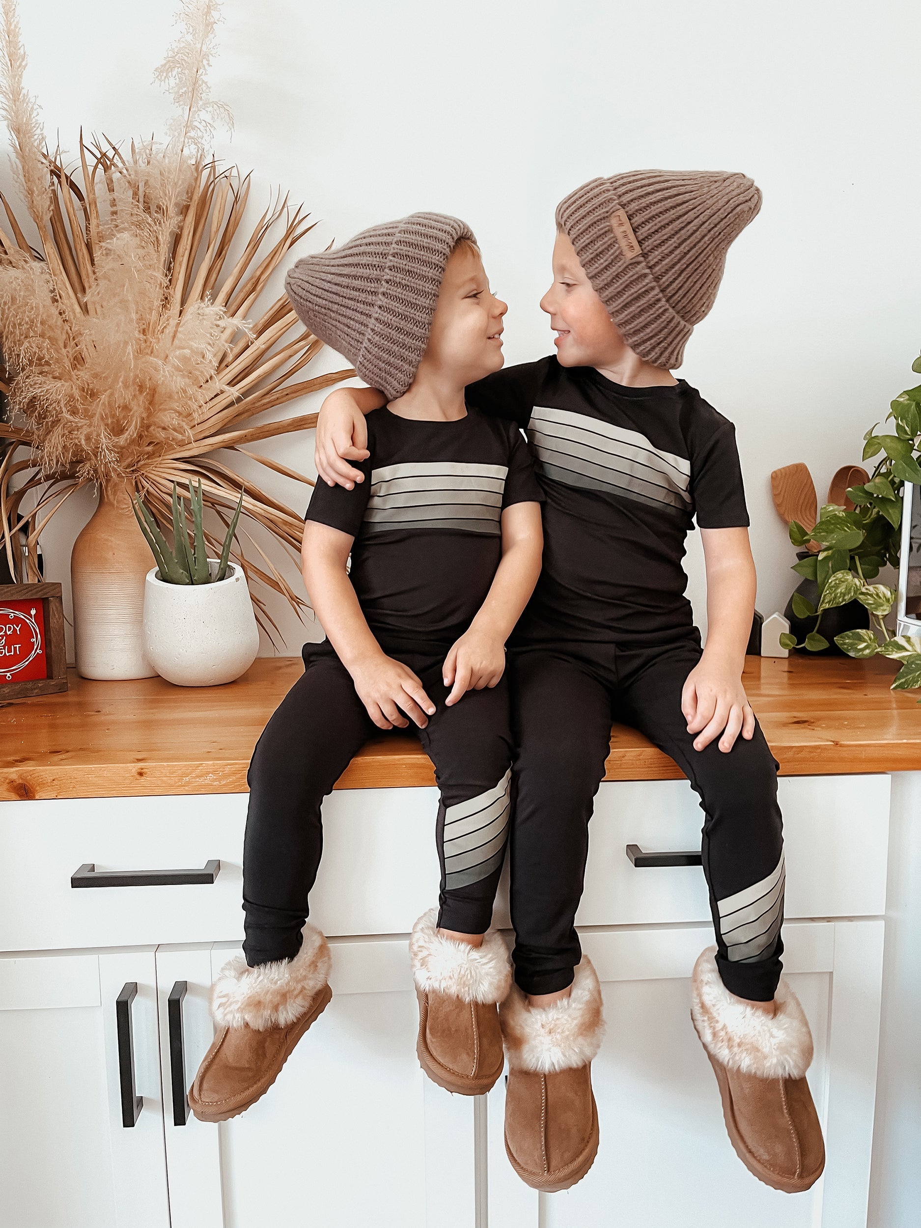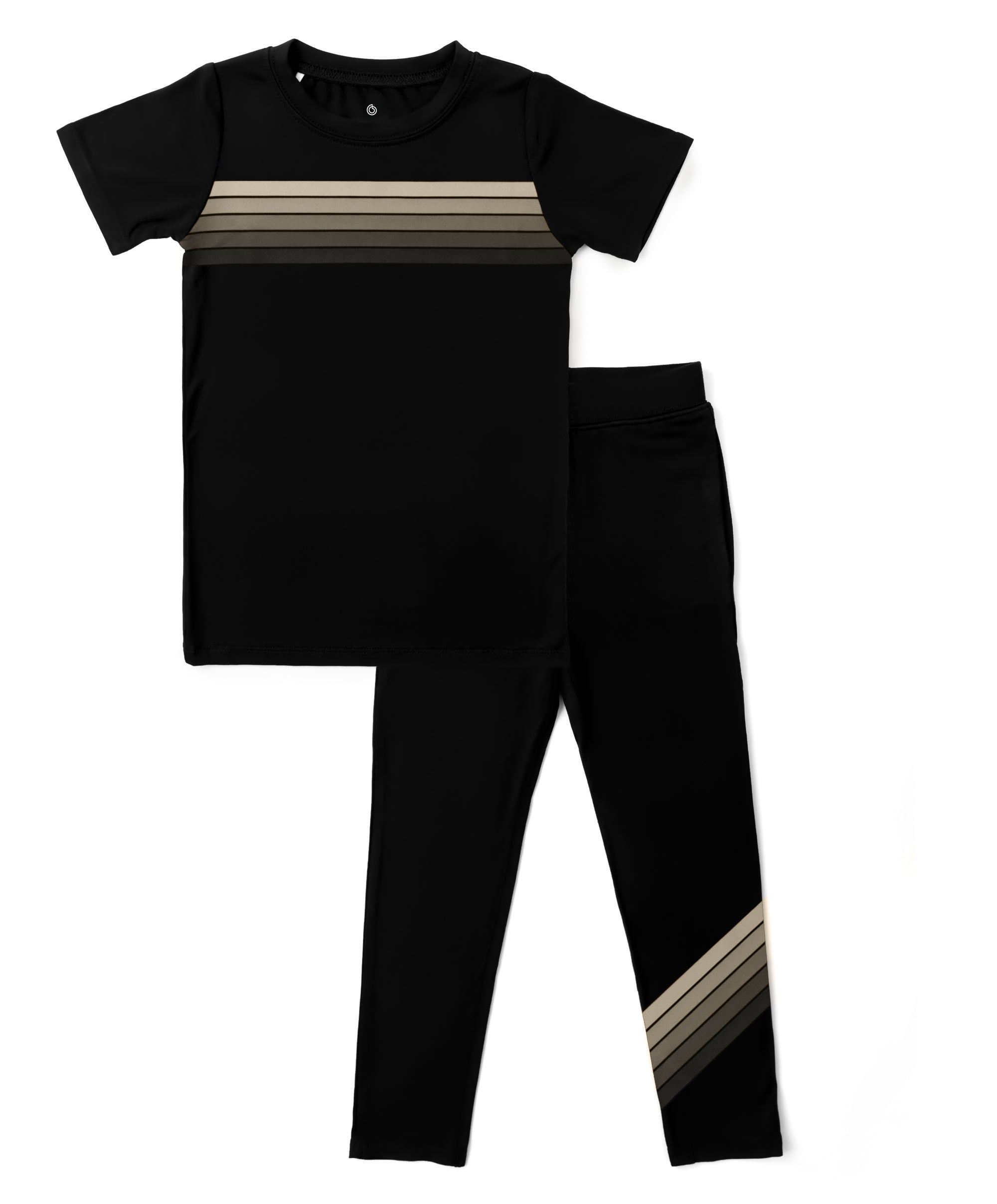 Retro Tan Stripe Two Piece Set — Crafted from a premium blend of Bamboo and Pima Cotton, our pj set offers a smooth, soft touch with just the right stretch. Breathable fabric ensures a comfy fit, making it perfect for restful nights or playful mornings. With its muted tan stripe and contemporary design, it's a stylish yet practical choice for every child's wardrobe.